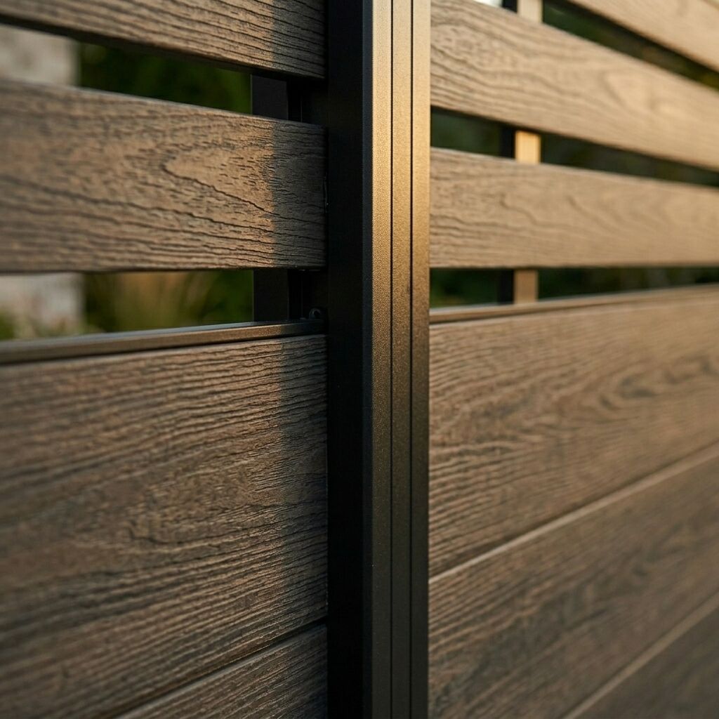 A modern, open-slat composite fence panel combining privacy screening with light and airflow — built for contractors, developers, and distributors supplying contemporary residential and commercial projects.