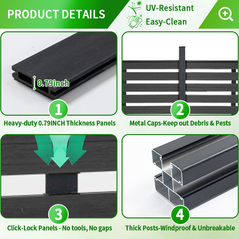 Engineered to withstand extreme weather conditions, from intense sun to heavy rain and freezing temperatures. The robust WPC construction guarantees your fence will not warp, crack, or splinter, ensuring a strong and beautiful backyard for years to come.