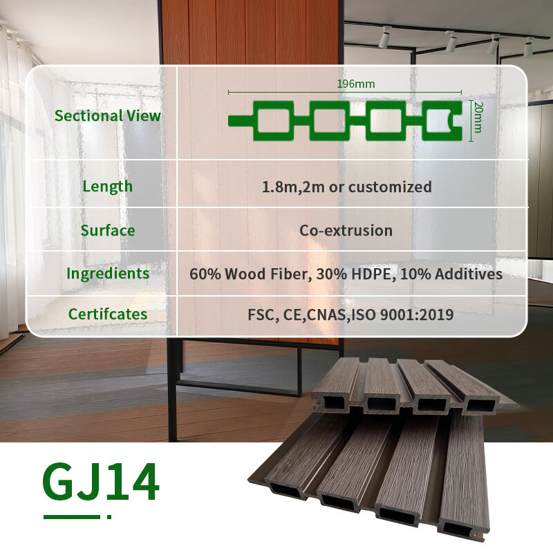 The GJ14 Co-Extruded WPC Fence by Treslam is a thin-slat composite fencing solution designed for modern architecture, airflow, and visual lightness. This second-generation model is crafted using advanced co-extrusion technology, delivering superior durability, low maintenance, and refined surface texture that mimics natural timber.